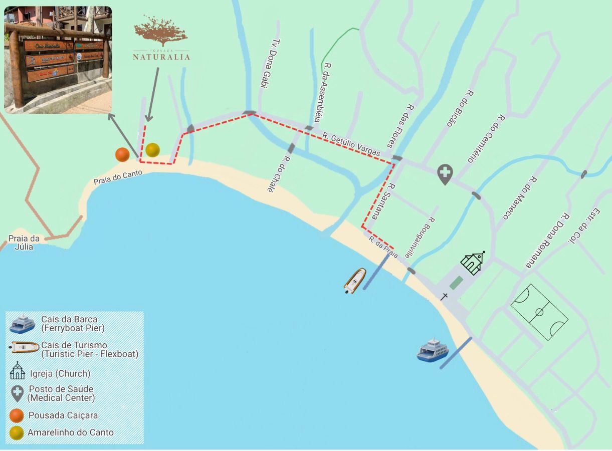 Nossa pousada fica na chamada Praia do Canto, a cerca de quinze minutos de caminhada desde o Cais Turístico da Vila do Abraão - principal porto de chegada à Vila do Abraão. É aproximadamente 1 km passando por ruas planas de terra, um trecho de praia (cerca de 100 metros de areia fofa) e, no fim, cerca de 100 metros em uma viela com calçamento rústico, sendo o trecho final em subida relativamente íngreme.